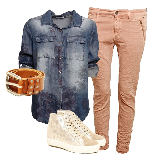 Första outfiten består av en vacker jeansliknade skjorta tillverkad av 100% tencel (cellulosamassa från snabbväxande träslag, framförallt eukalyptus och bok. I tillverkningsprocessen används träd från hållbarhetscertifierade plantager och 99,5% av alla kemikalier återvinns i ett slutet system). Faller otroligt fint! Matcha med ett par rosa byxor med dragkedjedetaljer.