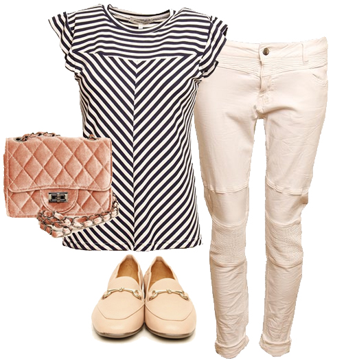 Näst ut är en riktigt vårig outfit. Den består av en blåvit topp med snygga ränder som smiter åt på ”rätt ställen”. För att få den här riktiga våriga känslan så kan du matcha med ett par vita byxor. Dessa har tuffa detaljer som gör att outfiten blir väldigt intressant. Till detta har vi valt den söta partyväskan Gilda i rosa samt ett par loafers i nude med spännen. Blir en fin helhet!
