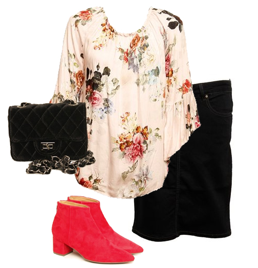 Det sista outfiten är för dig som gillar färg. Den består en supervacker tunika med blommönster i 100% viskos. Vi har matchat den med en snäv kjol i indigo, ett par läckra boots i rött, som blir en riktig färgklick samt den snygga partyväskan Gilda i svart. Stoppa gärna in blusen lite halvslarvigt i kjollinningen eller fickan för ett intressant och komplett intryck.